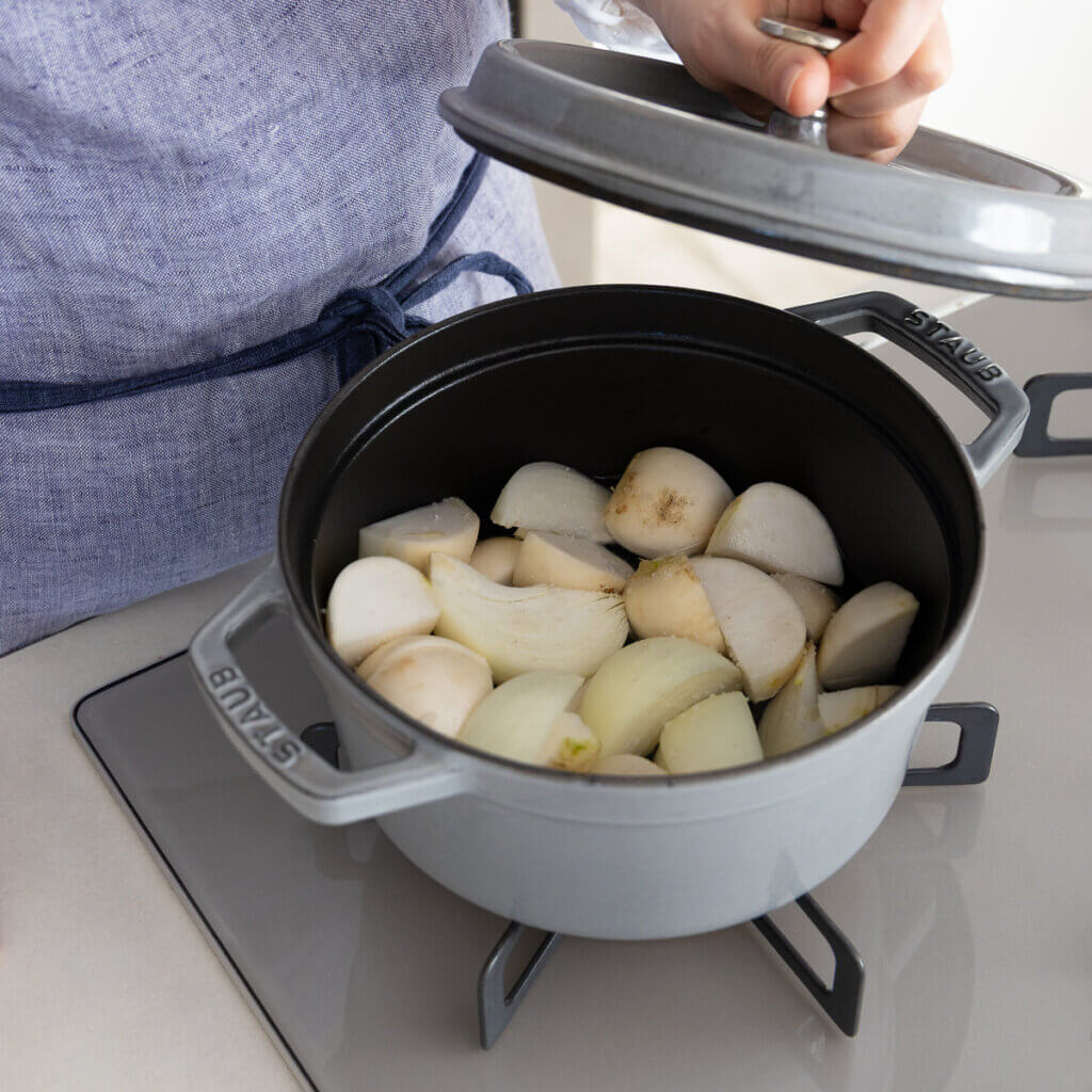 かぶと玉ねぎは、じっくりと蒸して甘さを引き出し