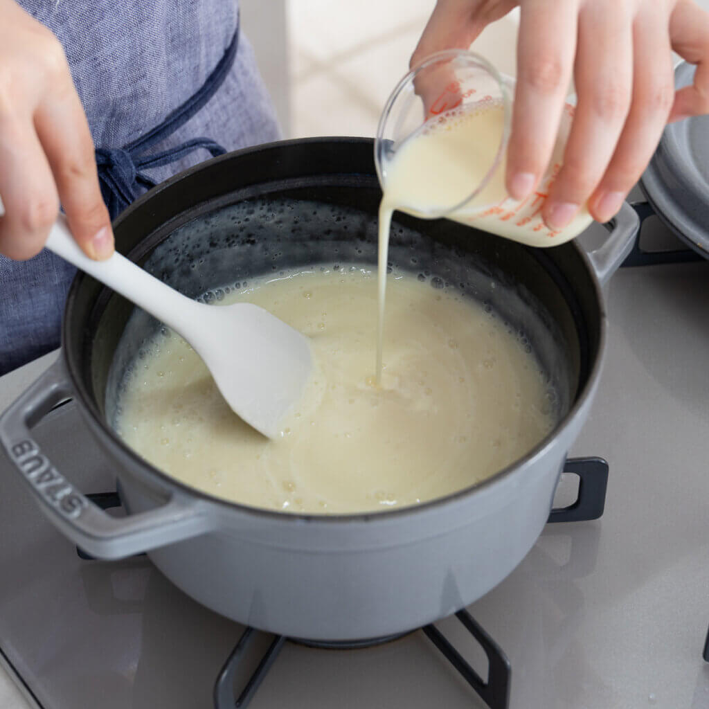 - 沸騰させてしまうと、豆乳が分離してしまうことがあるので注意してください。その場合は再びミキサーやブレンダーにかけるとなめらかになります。