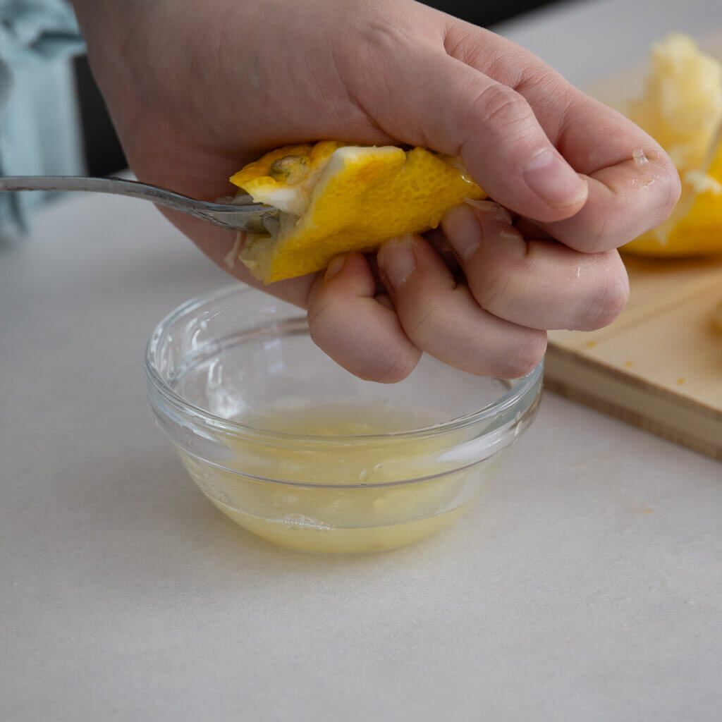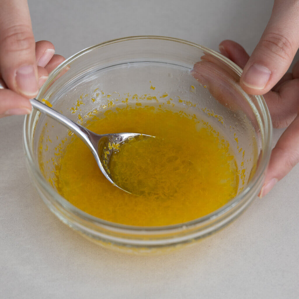 - ゆず果汁を絞り、白ワインビネガーと合わせて大さじ3になるように計量する。